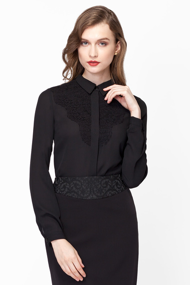 Великолепная блузка черного цвета. Модель классического покроя, но с оригинальной кружевной кокеткой спереди и потайной застежкой на планке.